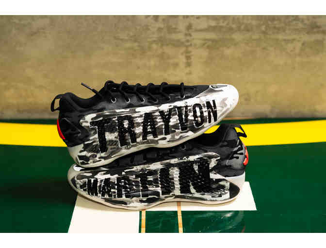 These shoes highlight the life and death of Trayvon Martin, a 17 year old Black boy fatally shot and killed while walking in his neighborhood in 2012. Trayvon's death sparked national debate around gun safety and Stand Your Ground laws. The shoe design features Trayvon's name printed in large letters across the outsides of the shoes, and his portrait on each toe, with Wheeler's #17 painted on the insides.