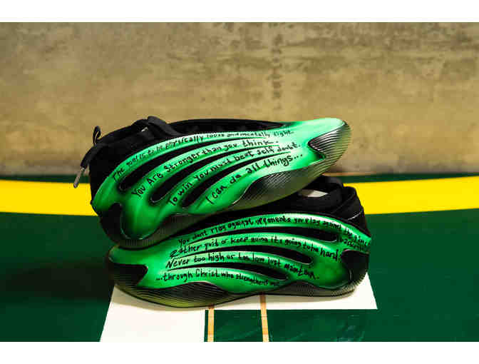 These shoes focus on mental health, as an issue that Zia is passionate about. Written in black against the green design are encouraging phrases and reminders: "the goal is to be physically loose and mentally tight...you are stronger than you think...to win you must beat self-doubt...I can do all things through Christ who strengthens me...you don't play against opponents you play against the game of basketball...rather quit or keep going it's going to be hard...never too high or too low just maintain"