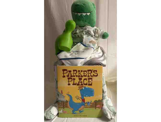 Yellow stool - toddler size with large plush Stegosaurus, 3T sleeper, a blanket, baby towel, "Parker's Place"