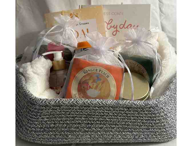 Woven grey basket filled with: