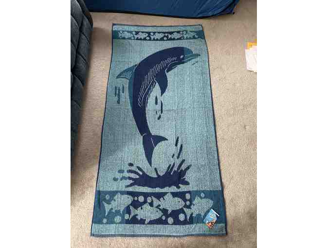 Dolphin Towel (NEW, with Tags). Note: There are doubles of this Towel in our Auction, if you'd like to get a MATCHED PAIR of 2   Super BIG SIZE, to wrap yourself up - for use at the Beach, Boat, Picnics, or Pool. Oversized wrap-around style (it's 72" wide x 36" high). Towel has a Reversible Design, with 2 color combinations (front and back are reversed-colored, with attractive navy blue and light blue shades). Easy laundry care: this "Dolphin Towel" is machine-washable and can be placed into the Dryer. Made of absorbant terrycloth. Available for shipping nationwide. Can be mailed to Winning Bidder (with insurance) or pick up for FREE in Enfield, CT. Adorable design!