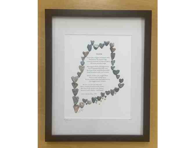 This framed state of Maine print, designed with heart rocks shaped by the surf along the Maine coast, from Love Rocks Me is a beautiful piece for any space. In the center of the Maine outline is a poem titled 'Maine' by Lester Melcher Hart.