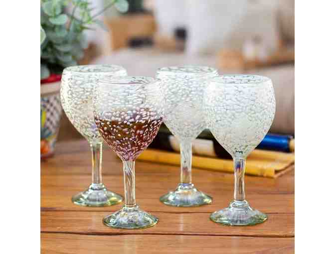 This set of four hand-blown wine glasses features dotted snow white accents giving them a frosty look. Part of the Mexican Artisan Blown Glass Collection, the unique glasses have lovely iridescent reflections and are crafted from recycled glass.