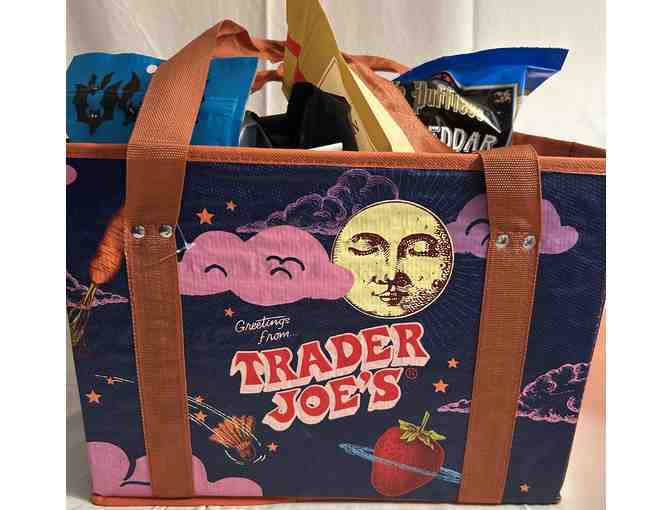 A large collapsible stand up reuseable Trader Joe's shopping bag filled with:
