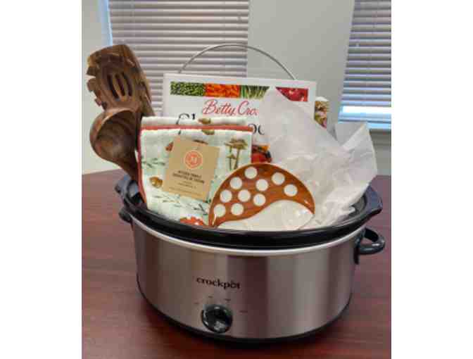 Enjoy this cozy kitchen bundle from Saco and Biddeford Savings, complete with a 7-quart crockpot, slow cooker cookbooks, kitchen towels, wooden utensils, and a spoon rest.