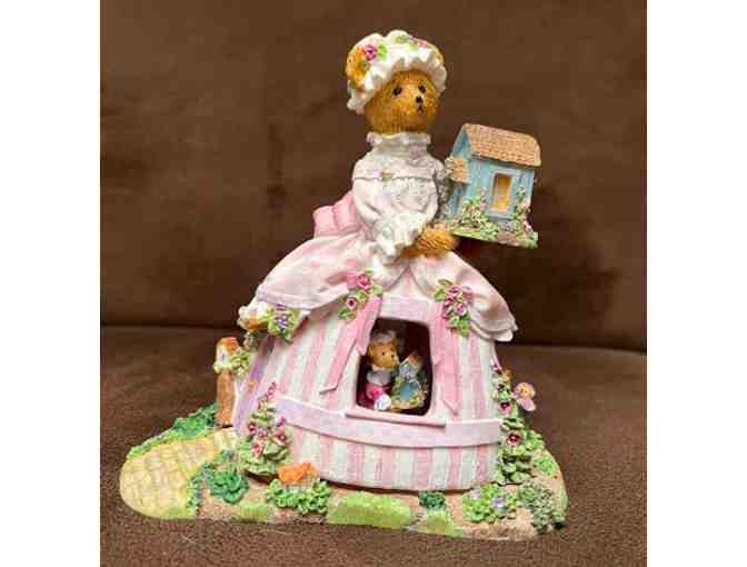 "Rose — The Collector" depicts a mother bear dressed in white and pink holding a collectible cottage. Her skirt forms the dwelling, and another bear inside holds another cottage. "Many Housemothers were collectors of one thing or another, but for Rose it was cottages."