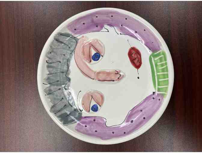 This gorgeous, unique hand-crafted dinner plate could be yours—right in time for the holidays! The plate measures 9” in diameter and is thrown from low fire white earthenware and decorated with bold colors in a majolica glazing process.