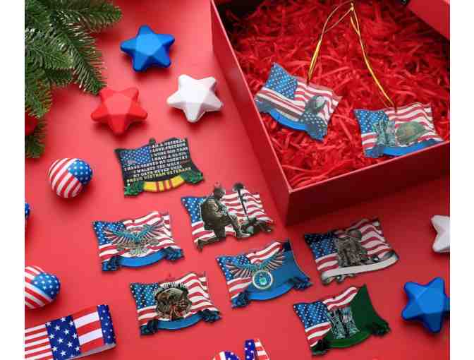 Set of 8- Designed with veterans in mind, these patriotic decorative hanging ornaments make a meaningful holiday gift, delivering a feeling of gratitude, respect, and awareness of their irreplaceable contribution.