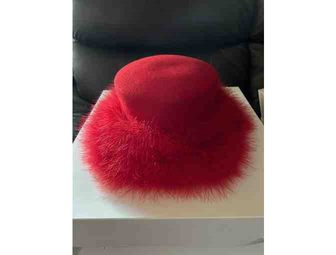 Turn heads this season with timeless sophistication in this stunning red felt winter hat, beautifully accented with luxurious faux fur around the edges.