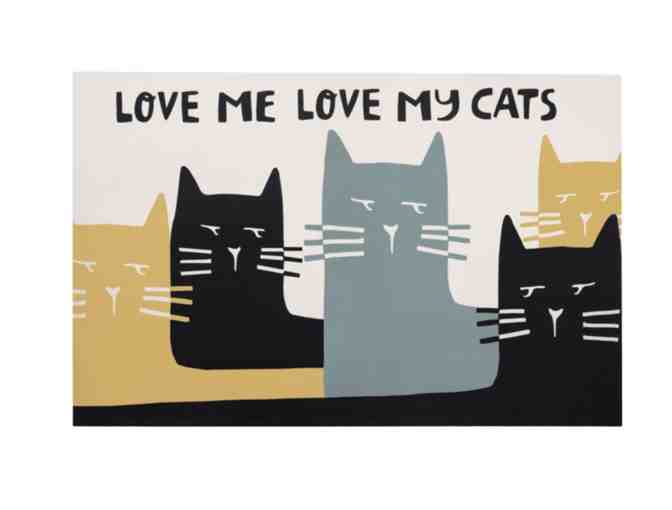 A small polyester pet mat from our Pet Collection featuring cat designs with "Love Me Love My Cats" sentiment and skid resistant backing. Our cat food mat is neatly rolled with a tag featuring full design