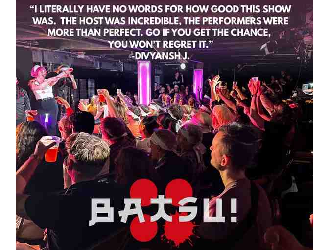 In Japan, there is a style of comedy known as batsu game, where comedians compete in challenges of all kinds with the losers receiving a punishment. BATSU! brings this comedy style to America, with comedians competing to avoid electric shocks, paintballs, a giant egg-smashing chicken, and many more hilarious jaw-dropping punishments!