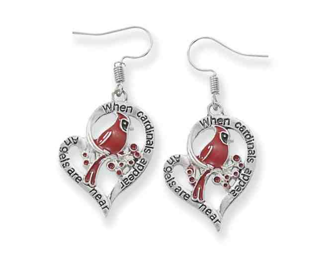 Our pretty earrings have an openwork design that features a red cardinal perched within a heart!