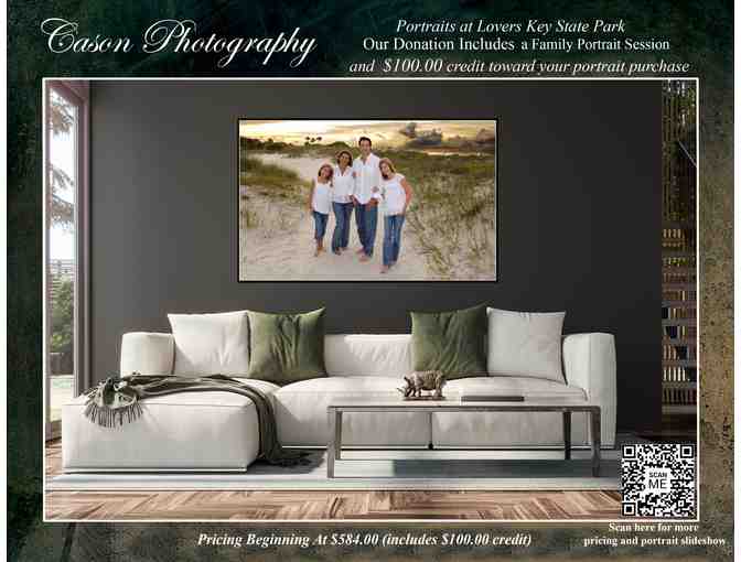 One Family Beach Portrait Session at Lovers Key State Park and $100.00 credit towards portrait order  Retail value $350.00.  Expires  6/1/2026 (Admission/parking fees not included in donation. No