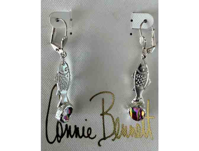 You are bidding on a beautiful pair of earrings with fish and glass. The fused glass transmits one color and reflects another color. The design is original, conversational and easy to care for.
